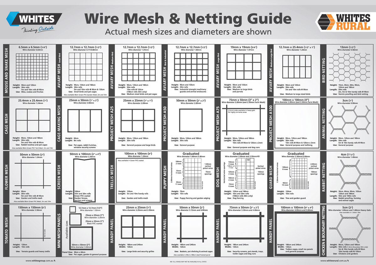 Whites Screen Mesh is ideal for use as a barrier, trellis or garden fence. It’s green coating protects the wire and blends into most gardens.