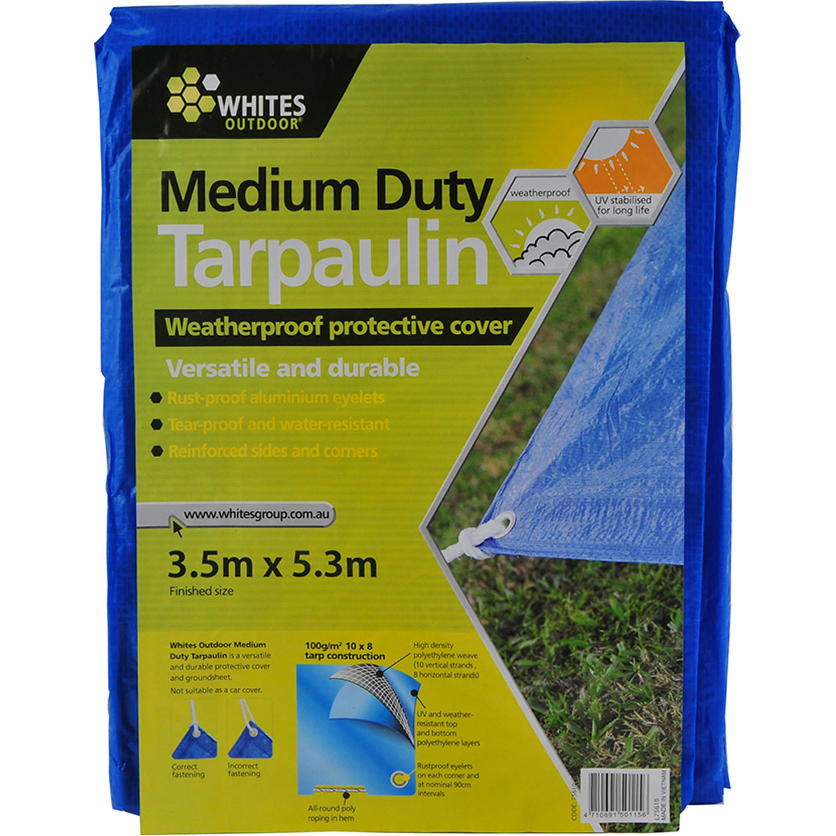 Whites Medium Duty Tarpaulins are a versatile and durable protective cover and groundsheet. These tarpaulins have a high-density UV resistant polyethylene weave (10x8), are tear-resistant and provide water-resistant triple-layer protection. Rustproof eyelets at nominal 90cm intervals ensure dependable tiedown.