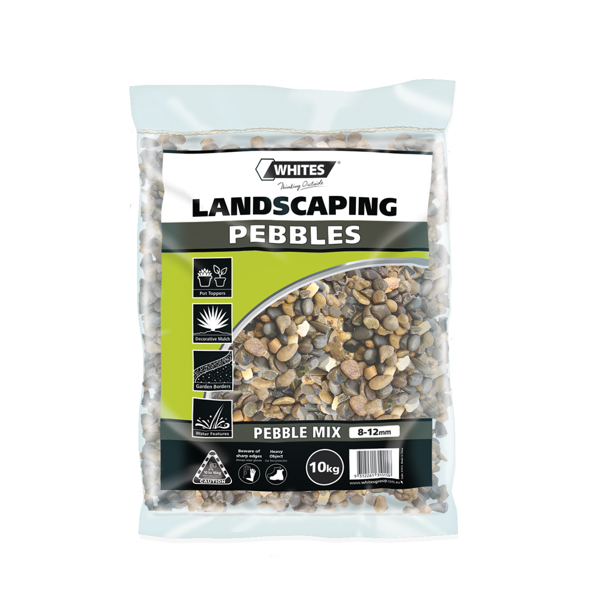 Whites Pebble Mix features small, rounded stones in natural beige, brown and dark grey colours.